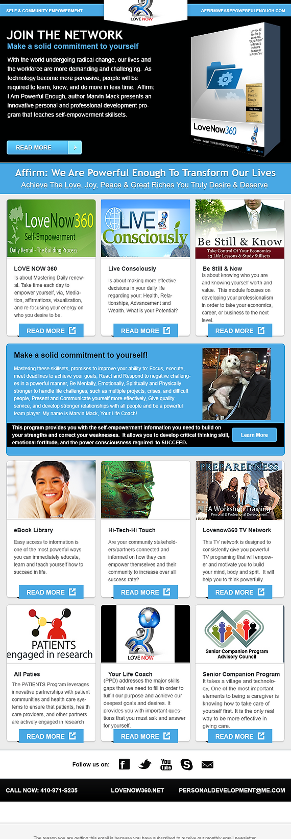 Our greatest hope is that we can work together towards Empowering Self, Community & World and being an example for the rest of the world. LoveNow360 Community Engagement and Empowerment Outreach Agenda Module is designed to address some of the major root challenges our community now face: Health Disparities, Poverty, Drug Addiction, Obesity, Depression, Mental Illness, Hypertension, Diabetes, Crime, Violence and more.